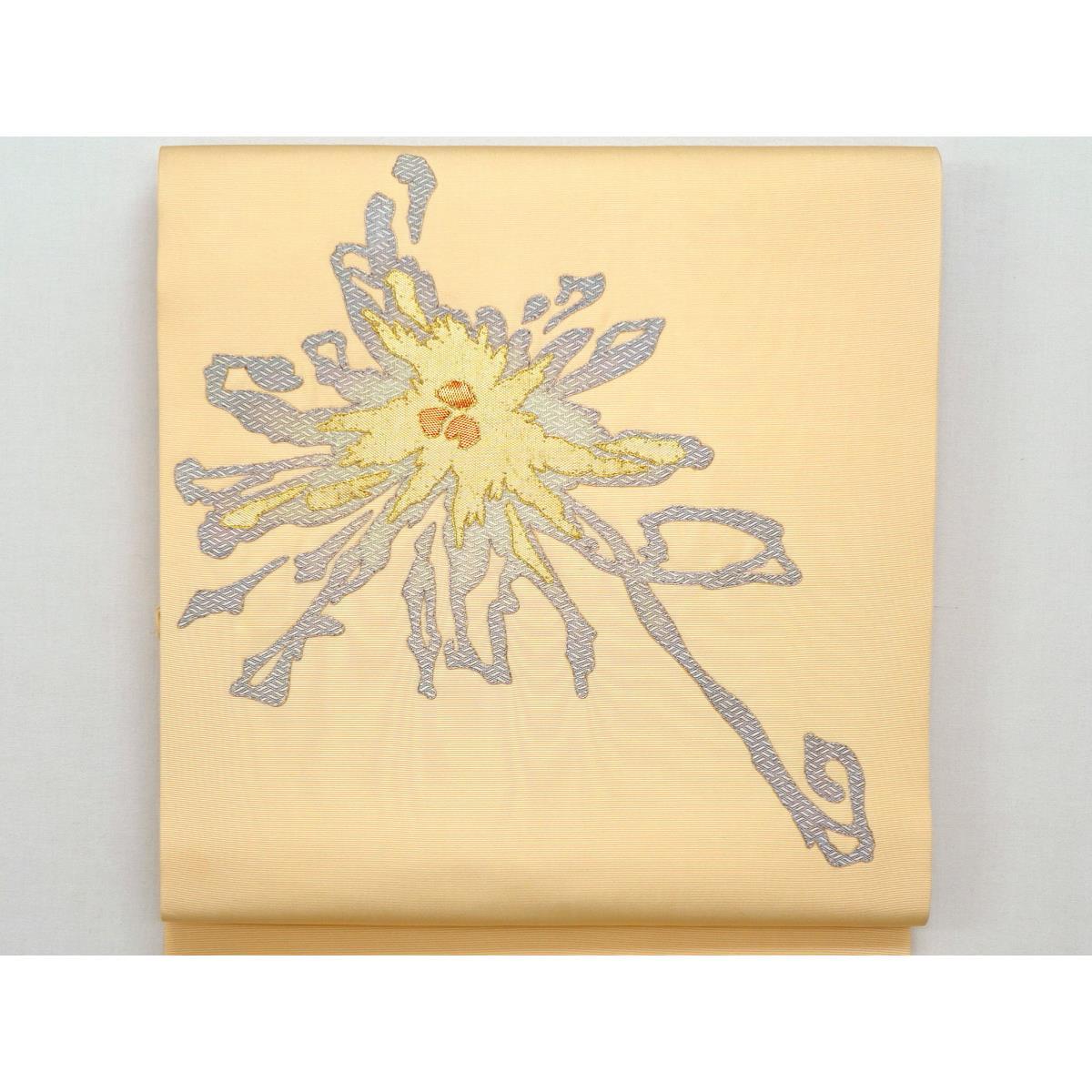 鈍く淡いオレンジ色で塩瀬の地に、別生地を上から張り合わせて模様にした名古屋帯です。
